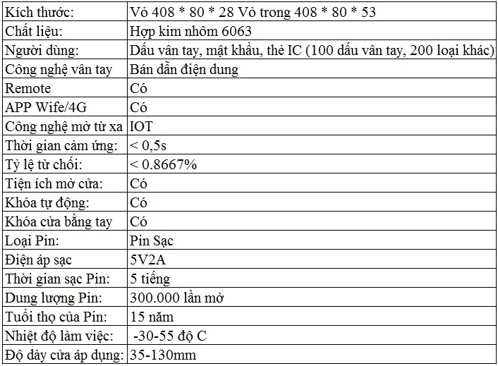 Thông số kỹ thuật khóa vân tay mở từ xa bằng điện thoại Kadol KD-K788: