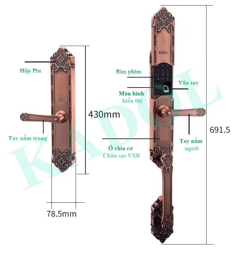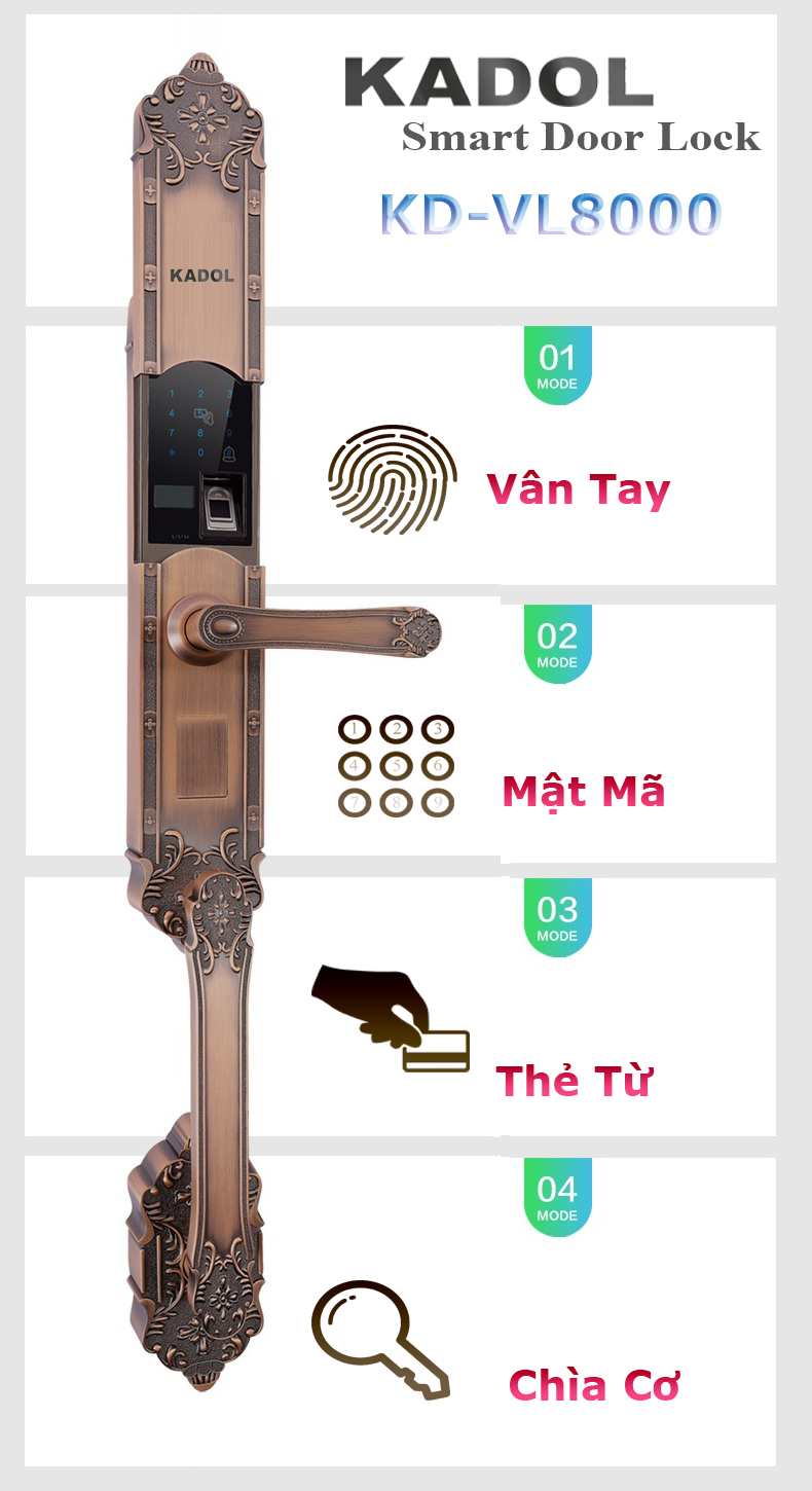 - Khóa cửa vân tay cổ điển biệt thự KADOL KD-VL8000 với 04 chức năng mở khóa