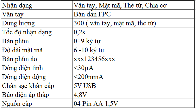 Thông số kỹ thuật khóa vân tay Kadol KD-VL8000:
